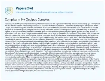 This essay about the Oedipus complex, initially expounded by Sigmund Freud, delves into its complexities, implications for childhood development, and its enduring influence on psychology and culture. It discusses Freud’s theories regarding children’s unconscious desires and rivalries towards their parents, exploring its manifestations, criticisms, and cultural resonance. Despite critiques and evolving psychological perspectives, the Oedipus complex remains a subject of scholarly discourse, shaping our understanding of human psychology and relationships. Through critical analysis, this essay navigates the intersection of psychoanalytic theory, historical context, and contemporary psychology, stimulating nuanced discussions on the formation of identity and interpersonal dynamics.