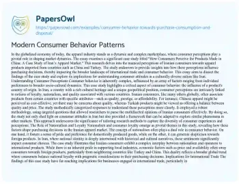 In the globalized economy of today, the apparel industry stands as a dynamic and complex marketplace, where consumer perceptions play a pivotal role in shaping market dynamics. The essay examines a significant case study titled "How Consumers Perceive the Products Made in China: A Case Study of Iran’s Apparel Market." This research delves into the nuanced perceptions of Iranian consumers towards apparel products imported from countries such as China and Turkey. The study endeavors to provide insights into how these perceptions influence purchasing decisions, thereby impacting the broader landscape of international trade and consumer behavior.