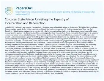 An exploration of the complex world within Corcoran State Prison in this essay. Delving beyond the headlines and controversies, the narrative unveils the multifaceted stories of inmates, correctional officers, and administrators. It navigates the challenges of a penal system grappling with issues of rehabilitation, overcrowding, and the delicate balance between punishment and redemption. From the echoes of notorious incidents to the daily rhythms of life within the institution, the essay sheds light on Corcoran’s role as a microcosm of broader societal complexities. It touches upon the prison’s historical controversies, its influence on the surrounding community, and the persistent questions surrounding justice, accountability, and the transformative potential within the stark confines of incarceration. Also at PapersOwl you can find more free essay examples related to Prison.