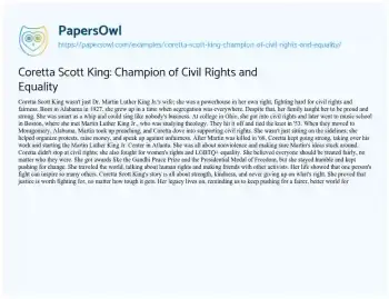 Coretta Scott King: Champion of Civil Rights and Equality. (2024, Jun 28). Retrieved from https://hub.papersowl.com/examples/coretta-scott-king-champion-of-civil-rights-and-equality/