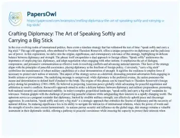This essay explores the enduring strategy of “speak softly and carry a big stick” in international politics. Delving into its origins and contemporary relevance, it unravels the delicate balance between diplomacy and strength. This age-old approach, often attributed to Theodore Roosevelt, advocates for tactful diplomacy while maintaining robust military capabilities. It highlights the art of negotiation and persuasive communication alongside the readiness to employ force if necessary. The essay examines how this strategy, born in Roosevelt’s era, continues to guide nations in today’s complex geopolitical landscape, offering a pathway to peaceful coexistence and safeguarding national interests. It underscores the importance of diplomacy backed by credible military strength in preserving peace and deterring aggression on the global stage. Moreover, at PapersOwl, there are additional free essay samples connected to Diplomacy.