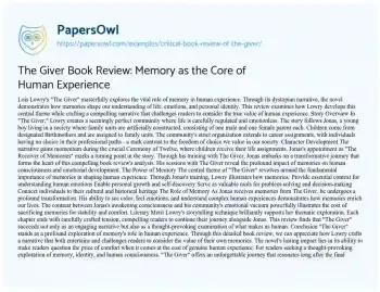 The Giver Book Review: Memory as the Core of Human Experience. (2021, Mar 18). Retrieved from https://hub.papersowl.com/examples/critical-book-review-of-the-giver/