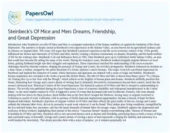 Steinbeck's Of Mice and Men: Dreams, Friendship, and Great Depression. (2019, Sep 04). Retrieved from https://hub.papersowl.com/examples/cultural-context-in-of-mice-and-men/