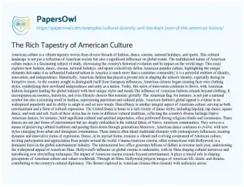 The Rich Tapestry of American Culture. (2022, Aug 19). Retrieved from https://hub.papersowl.com/examples/cultural-diversity-and-the-back-born-of-the-american-history/