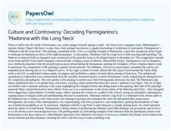 This essay explores Parmigianino’s ‘Madonna with the Long Neck’, a remarkable piece of the Mannerist era that breaks away from the conventional norms of Renaissance art. The painting is characterized by its elongated figures, notably the Madonna and the Christ child, which imbue the work with an ethereal and otherworldly beauty. This stylistic choice represents a deliberate shift from the proportional accuracy of the High Renaissance to a more expressive, individualistic approach. The essay delves into the painting’s asymmetric composition and rich color palette, highlighting how these elements create a dramatic and captivating visual experience. It also discusses various interpretations of the painting’s symbolism, particularly the unfinished column, which has been a topic of debate among art historians. The piece positions ‘Madonna with the Long Neck’ as a bold statement in the history of art, reflecting the transition to Mannerism and challenging traditional perceptions of beauty and divine representation. The essay concludes by emphasizing the painting’s significance in illustrating the evolution of artistic expression and cultural perspectives during the Renaissance era. Moreover, at PapersOwl, there are additional free essay samples connected to Culture