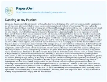 In this personal essay, the writer will share their journey and experiences with dancing, expressing why it is their passion. The essay will discuss how dancing has impacted their life, providing a sense of expression, freedom, and joy. It will reflect on the physical, emotional, and social aspects of dancing, and how it serves as a powerful form of communication and self-expression. Additionally, PapersOwl presents more free essays samples linked to Passion.