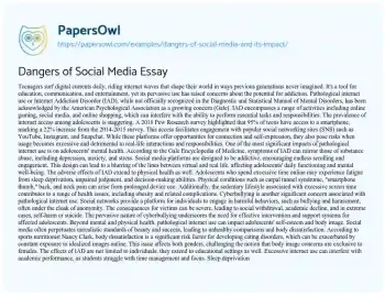 In contrast, This essay will focus on the potential dangers and negative impacts of social media, including mental health issues, misinformation, privacy concerns, and cyberbullying. Moreover, at PapersOwl, there are additional free essay samples connected to Addiction.