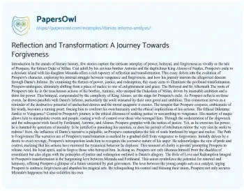 In conclusion, Prospero's journey from vengeance to forgiveness is a testament to the transformative power of introspection and grace. Through his reflection, inspired by Dante's Inferno, Prospero confronts the moral complexities of his actions and emerges as a figure of redemption. By choosing forgiveness over retribution, he liberates himself from the burdens of anger and malice, finding peace and renewed purpose. This narrative underscores the enduring truth that the path to enlightenment is paved with forgiveness, and that true strength lies in the ability to transcend past grievances and embrace the possibility of a harmonious future.