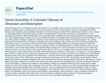 Darren Aronofsky: A Cinematic Odyssey of Obsession and Redemption. (2023, Oct 16). Retrieved from https://hub.papersowl.com/examples/darren-aronofsky-a-cinematic-odyssey-of-obsession-and-redemption/