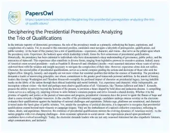 This essay about the prerequisites for the presidency explores the essential qualities of experience, character, and vision that candidates must possess to lead a nation effectively. It emphasizes how these qualities have shaped the legacies of past presidents like George Washington and Franklin D. Roosevelt, and discusses their enduring significance in today’s evolving political landscape, marked by digital connectivity and changing societal expectations.