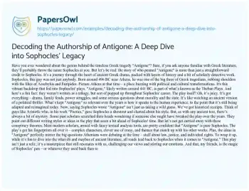This essay takes a lively and engaging dive into the authorship of the ancient Greek tragedy “Antigone,” traditionally attributed to Sophocles. It presents a blend of historical context, literary analysis, and a touch of humor to explore the complexities behind this attribution. Sophocles, a central figure in Greek drama, is placed at the heart of this exploration, with the essay painting a vivid picture of the political and cultural landscape of Athens during his time. The essay not only reaffirms Sophocles’ authorship, backed by historical references and thematic analysis, but also addresses the intriguing speculations and debates that have arisen over the centuries. It highlights the play’s enduring themes of morality, law, and individual versus state, showcasing its relevance even in modern times. Written in a conversational and slightly playful tone, the essay is both informative and enjoyable, offering insights into why “Antigone” remains a cornerstone of classical literature and a testament to Sophocles’ literary genius. PapersOwl offers a variety of free essay examples on the topic of Antigone.
