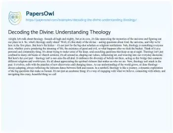 This essay demystifies theology, revealing it as more than an academic pursuit. It’s a personal and communal journey, weaving through the profound questions about God, the universe, and human existence. From the intricacies of everyday life to its impact on art and ethics, theology serves as a vibrant tapestry shaping our beliefs and values. Embracing diversity, it acts as a bridge between different faiths and worldviews, fostering understanding in a complex world. As a dynamic field, theology adapts to changing times, reflecting the evolving complexities of human thought. Join the exploration, connecting with the essence of what it means to be human. Additionally, PapersOwl presents more free essays samples linked to Theology.