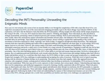 Decoding the INTJ Personality: Unraveling the Enigmatic Minds. (2024, Jan 26). Retrieved from https://hub.papersowl.com/examples/decoding-the-intj-personality-unraveling-the-enigmatic-minds/