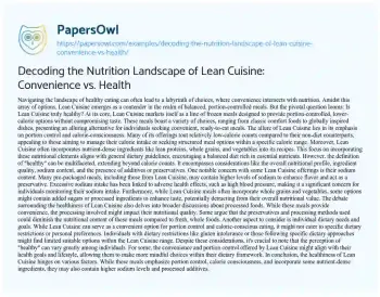 An essay exploring the health aspects of Lean Cuisine delves into the nutritional nuances of these frozen meals. It evaluates their suitability within a healthy eating regimen by dissecting factors like calorie control, ingredient quality, and the impact of processing. The essay examines the balance between convenience and nutrition, assessing Lean Cuisine’s focus on portion control and nutrient incorporation against potential drawbacks such as higher sodium levels and additives. It contemplates the broader conversation around processed foods and their role in modern diets while encouraging a nuanced understanding of what constitutes a “healthy” meal. Ultimately, the essay encourages critical analysis of Lean Cuisine’s place within individual dietary contexts, acknowledging its potential as a convenient option while highlighting considerations for a balanced approach to nutrition. On PapersOwl, there’s also a selection of free essay templates associated with Nutrition.