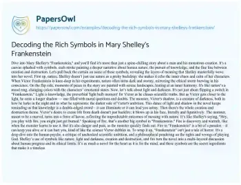 This essay peels back the layers of symbolism in Mary Shelley’s iconic “Frankenstein,” revealing how the novel is much more than a classic horror story. It delves into the various symbols Shelley uses to weave a narrative rich in themes of human nature, ethical science, and the dichotomy of creation and destruction. Nature serves as a reflective canvas, mirroring the emotional states of the characters, while the interplay of light and darkness symbolizes the pursuit of knowledge and its moral implications. The essay also explores the contrasting themes of creation and destruction as seen through Victor’s ambitious scientific endeavors, which lead to unforeseen chaos. Additionally, the symbol of fire is examined for its dual representation of discovery and danger, mirroring the novel’s central themes. This exploration not only illuminates the depth of Shelley’s novel but also invites readers to ponder the moral responsibilities inherent in scientific advancement. The essay presents “Frankenstein” as a layered tale that intertwines horror with profound philosophical and ethical questions, showcasing Shelley’s mastery in using symbolism to enrich her narrative. PapersOwl offers a variety of free essay examples on the topic of Frankenstein.