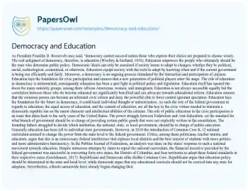 This essay will discuss the relationship between democracy and education. It will explore how education supports democratic values, encourages civic engagement, and prepares individuals to participate actively in democratic societies. Additionally, PapersOwl presents more free essays samples linked to Brown V Board Of Education.