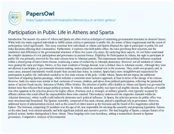 Participation in Public Life in Athens and Sparta. (2019, Aug 26). Retrieved from https://hub.papersowl.com/examples/democracy-in-ancient-greece/