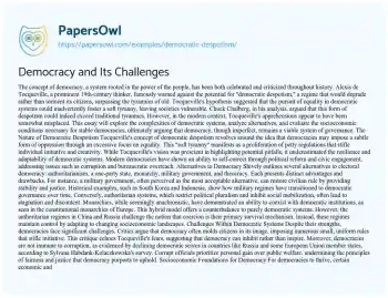 However, in the modern context, Tocqueville's apprehensions appear to have been somewhat misplaced. This essay will explore the complexities of democratic systems, analyze alternatives, and evaluate the socioeconomic conditions necessary for stable democracies, ultimately arguing that democracy, though imperfect, remains a viable system of governance.