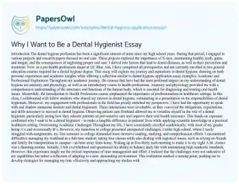 In this application essay, the author will outline their motivation and qualifications for pursuing a career in dental hygiene. It will discuss their passion for oral health, relevant experiences, and the skills they bring to the field. The piece will also reflect on the importance of dental hygiene in overall health and the author’s goals and aspirations in the profession. More free essay examples are accessible at PapersOwl about Dentistry.