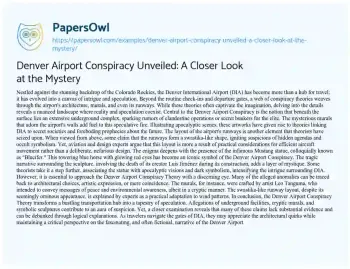 In navigating through this intriguing tapestry, the essay prompts travelers and enthusiasts to appreciate the architectural quirks of DIA while maintaining a critical perspective on the captivating, albeit often fictional, narrative of the Denver Airport Conspiracy. The text serves as both a guide to the conspiracy theories and a reminder to separate fact from speculation when contemplating the mysteries that surround this iconic transportation hub. At PapersOwl too, you can discover numerous free essay illustrations related to Mystery.