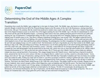 This essay is about identifying the end of the Middle Ages, a period marked by significant historical events rather than a single moment. It discusses key developments like the fall of Constantinople in 1453, which shifted trade routes and power dynamics; the invention of the printing press around 1440, which revolutionized knowledge dissemination; and the Renaissance, which emphasized humanism and classical learning. It also highlights the Protestant Reformation starting in 1517, the Age of Exploration beginning in the late 15th century, and the societal impacts of the Black Death in the 14th century. These events collectively contributed to the transition from medieval to modern Europe.