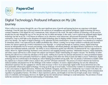 In this essay, I aim to explore the profound impact digital technology has had on my life. I will discuss its influence on my education, social interactions, and personal development. Through this exploration, I hope to shed light on the ubiquitous role digital technology plays in shaping modern existence and how it has become an integral part of my identity.