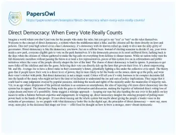 This essay about direct democracy presents a lively discussion on the concept of governance where citizens have the direct power to make decisions on laws and policies, bypassing representatives. It contrasts direct democracy with the representative system, illustrating how direct involvement can increase civic engagement and make every vote count. The essay acknowledges the historical roots of this system in ancient Athens and considers the practical challenges and criticisms, such as the potential for majority rule to overshadow minority rights and the complexity of modern governance. Despite these concerns, it suggests that incorporating elements of direct democracy in today’s political landscape could enhance public participation and trust in the democratic process. The piece concludes by exploring the potential for a hybrid approach that combines the expertise of elected officials with increased direct input from the public, reflecting on the evolving nature of democracy in the digital age. More free essay examples are accessible at PapersOwl about Democracy.