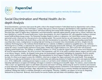 Social Discrimination and Mental Health: An In-depth Analysis. (2021, May 14). Retrieved from https://hub.papersowl.com/examples/discrimination-against-mentally-ill-individuals/