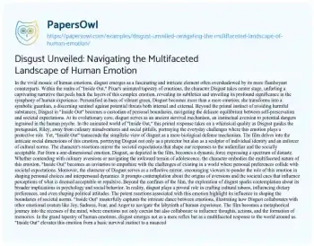 A captivating exploration of the emotion of disgust as portrayed in Pixar’s animated masterpiece, “Inside Out.” This essay delves into the nuanced and multifaceted nature of disgust, personified through the character of the same name. Beyond its primal function as a survival mechanism, the essay unravels the social dimensions of disgust, examining how it shapes individual identity and enforces cultural norms. Using scenes from “Inside Out,” it navigates the intricate dance between personal boundaries and societal expectations. The essay invites readers to reflect on the role of disgust in human psychology, its evolutionary origins, and its broader implications in shaping behaviors, preferences, and even cultural taboos. Through the lens of animation, it explores the rich tapestry of human emotions and the profound intricacies of navigating the world guided by the vibrant green hues of Disgust. Additionally, PapersOwl presents more free essays samples linked to Emotion.