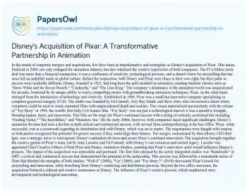 Disney's Acquisition of Pixar: A Transformative Partnership in Animation. (2024, May 28). Retrieved from https://hub.papersowl.com/examples/disneys-acquisition-of-pixar-a-transformative-partnership-in-animation/