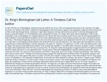 Dr. King’s Birmingham Jail Letter: A Timeless Call for Justice. (2024, Jul 06). Retrieved from https://hub.papersowl.com/examples/dr-kings-birmingham-jail-letter-a-timeless-call-for-justice/