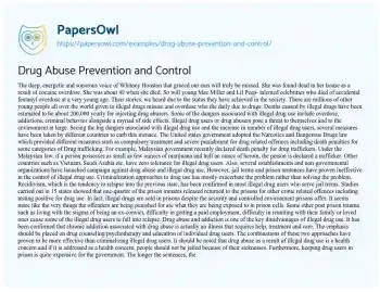 This essay will discuss strategies for preventing and controlling drug abuse. It will cover various approaches, including education, policy changes, rehabilitation programs, and law enforcement efforts, to provide a multi-faceted view of drug abuse prevention and control. Additionally, PapersOwl presents more free essays samples linked to Crime Prevention.