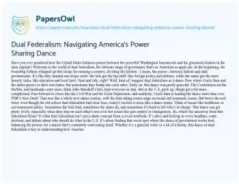 The essay brings into focus how, over time, dual federalism has transformed from its original ‘neat and tidy’ format into a more intricate and intertwined relationship. Contemporary issues like healthcare, environmental policy, and immigration showcase this complex interplay, where leading roles alternate and overlap. In essence, this piece presents dual federalism not just as a political concept, but as a living, breathing aspect of American governance, constantly adapting to the nation’s rhythm and challenges. It’s an engaging look at how the power-sharing dance between federal and state levels shapes the very core of how America operates. On PapersOwl, there’s also a selection of free essay templates associated with Federalism.