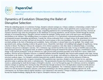 This essay about the dynamics of evolution explores disruptive selection as a master conductor, orchestrating a ballet of genetic divergence within populations. In contrast to stabilizing and directional selection, disruptive selection takes the lead, propelling populations into a mesmerizing dance of genetic diversity. The narrative unfolds on a grand theatrical stage where the protagonists, inhabitants of evolving populations, navigate the intricate interplay of environmental factors. Examining instances like the African seedcracker finch and the peppered moth, the essay illustrates how disruptive selection shapes distinct phenotypic groups, leaving an indelible mark across the biological spectrum. Beyond aesthetics, disruptive selection influences behaviors, reproduction, and ecological roles, creating a rich tapestry of adaptation and survival. In the contemporary era, human-induced changes in habitats and pollution add a new dimension, engaging disruptive selection in an anthropogenic symphony. The essay concludes by portraying disruptive selection as a testament to the dynamism of evolution, emphasizing genetic diversity as the currency of adaptation. Moreover, at PapersOwl, there are additional free essay samples connected to Evolution.