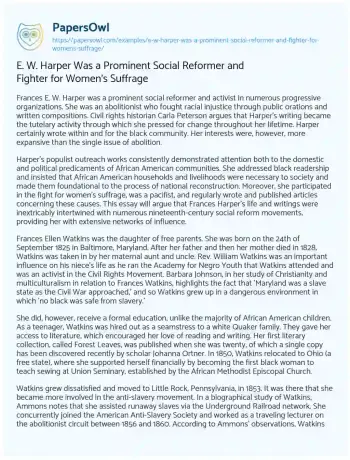 E. W. Harper Was a Prominent Social Reformer and Fighter for Women's Suffrage. (2023, Mar 25). Retrieved from https://hub.papersowl.com/examples/e-w-harper-was-a-prominent-social-reformer-and-fighter-for-womens-suffrage/