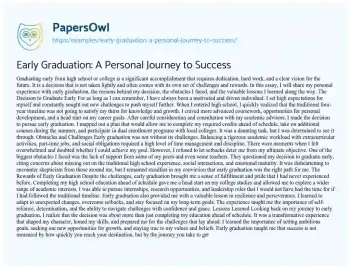 Graduating early from high school or college is a significant accomplishment that requires dedication, hard work, and a clear vision for the future. It is a decision that is not taken lightly and often comes with its own set of challenges and rewards. In this essay, I will share my personal experience with early graduation, the reasons behind my decision, the obstacles I faced, and the valuable lessons I learned along the way.