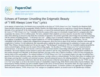 Echoes of Forever: Unveiling the Enigmatic Beauty of "I Will Always Love You" Lyrics. (2024, Jan 26). Retrieved from https://hub.papersowl.com/examples/echoes-of-forever-unveiling-the-enigmatic-beauty-of-i-will-always-love-you-lyrics/