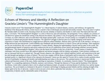 This essay delves into the rich thematic tapestry of Graciela Limón’s novel “The Hummingbird’s Daughter.” Set against the Mexican Revolution, the narrative centers around Teresa, a young woman on a poignant journey of self-discovery and cultural exploration. The essay examines how Limón weaves complex themes of identity, memory, and resilience into her protagonist’s story, using Teresa’s struggles to mirror broader issues of cultural identity formation. It highlights the crucial role of memory in connecting Teresa to her heritage, portraying these recollections as vital components of her identity. The theme of resilience is explored both as a personal trait and a cultural characteristic, demonstrating how traditions and historical connections offer strength in adversity. Additionally, the essay delves into the novel’s spiritual elements, discussing how Teresa’s spiritual path intertwines with her cultural and personal identity. Overall, the essay presents “The Hummingbird’s Daughter” as a profound exploration of identity, heritage, and the human spirit, offering insights into the universal experiences of self-discovery and resilience amid historical and cultural upheavals. Also at PapersOwl you can find more free essay examples related to Identity.