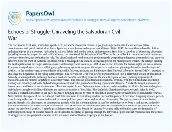 This essay is about the Salvadoran Civil War, a turbulent period in El Salvador’s history from 1980 to 1992. It explores the roots of the conflict, sparked by social inequality and political unrest, leading to widespread violence and suffering. The summary highlights the pivotal events of the war, including Archbishop Óscar Romero’s assassination and the emergence of guerrilla factions like the FMLN. It also discusses international involvement and efforts towards peace, culminating in the Chapultepec Peace Accords. Despite the war’s end, the essay emphasizes the lasting impact on El Salvador, with lingering social divisions and challenges in reconciliation and healing. PapersOwl showcases more free essays that are examples of Civil War.