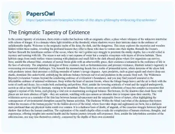 The Enigmatic Tapestry of Existence. (2024, Mar 25). Retrieved from https://hub.papersowl.com/examples/echoes-of-the-abyss-philosophy-embracing-the-unknown/