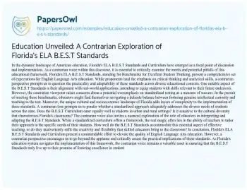 Ultimately, the contrarian exploration seeks to peel back the layers of Florida’s ELA B.E.S.T Standards, challenging assumptions, and sparking a nuanced conversation about the true essence of education and its role in shaping the next generation. Moreover, at PapersOwl, there are additional free essay samples connected to Education.