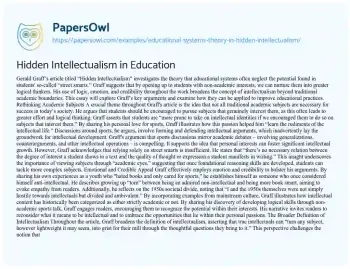 This essay will apply educational systems theory to analyze Gerald Graff’s essay “Hidden Intellectualism.” It will discuss how the theory sheds light on the essay’s argument that academic and street smarts are equally valuable forms of intelligence. The piece will explore the implications of this theory for educational practices and the recognition of diverse forms of intellectualism. At PapersOwl, you’ll also come across free essay samples that pertain to Academic Interests.