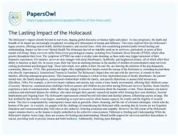 The Lasting Impact of the Holocaust. (2019, Aug 07). Retrieved from https://hub.papersowl.com/examples/effects-of-the-holocaust/