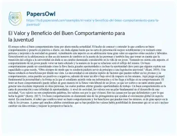 El Valor y Beneficio del Buen Comportamiento para la Juventud. (2026, Feb 06). Retrieved from https://hub.papersowl.com/examples/el-valor-y-beneficio-del-buen-comportamiento-para-la-juventud/