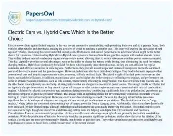 This essay will compare electric and hybrid cars. It will discuss their technology, environmental impact, performance, and cost, helping readers understand the pros and cons of each type. More free essay examples are accessible at PapersOwl about Cars.