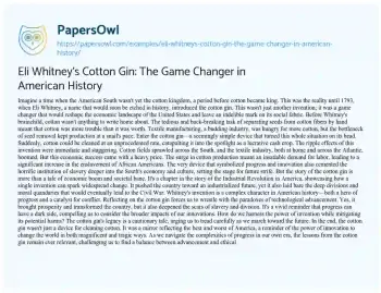 Eli Whitney's Cotton Gin: The Game Changer in American History. (2024, Mar 25). Retrieved from https://hub.papersowl.com/examples/eli-whitneys-cotton-gin-the-game-changer-in-american-history/