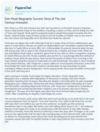Elon Musk Biography: Success Story of The 21st Century Innovator. (2020, May 10). Retrieved from https://hub.papersowl.com/examples/elon-musk-biography-success-story-of-the-21st-century-innovator/