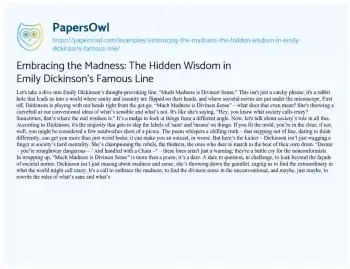 Embracing the Madness: The Hidden Wisdom in Emily Dickinson’s Famous Line. (2023, Dec 22). Retrieved from https://hub.papersowl.com/examples/embracing-the-madness-the-hidden-wisdom-in-emily-dickinsons-famous-line/