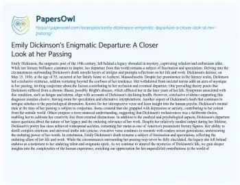 Emily Dickinson's Enigmatic Departure: A Closer Look at her Passing. (2024, May 12). Retrieved from https://hub.papersowl.com/examples/emily-dickinsons-enigmatic-departure-a-closer-look-at-her-passing/
