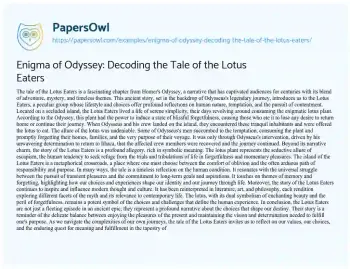 This essay delves into the intriguing tale of the Lotus Eaters from Homer’s Odyssey, exploring its profound allegorical significance and timeless appeal. It portrays the Lotus Eaters’ lifestyle, centered around the consumption of the lotus plant which induces forgetfulness and contentment, as a metaphor for the human inclination towards escapism and the allure of transient pleasures. The narrative examines the pivotal choice between succumbing to momentary bliss and pursuing one’s long-term goals and purpose, a theme that resonates deeply with the human condition. Furthermore, the essay highlights the enduring influence of the Lotus Eaters’ story in modern culture, emphasizing its relevance in discussions about memory, identity, and the delicate balance between enjoying present pleasures and staying true to one’s journey and aspirations. At PapersOwl too, you can discover numerous free essay illustrations related to Odyssey.